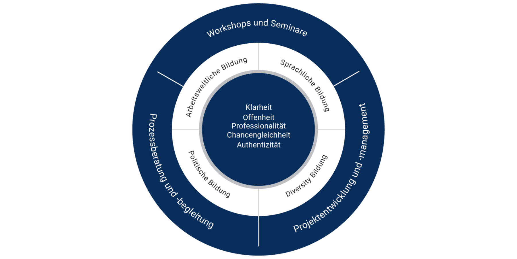 Im Kern findet sich unser Wertefundament. Diese Werte bilden die Grundlage für all unser Tun. Sie helfen uns, uns immer wieder zu fokussieren.